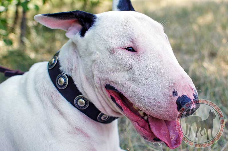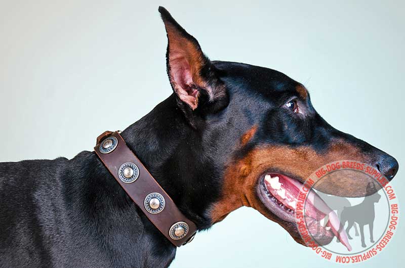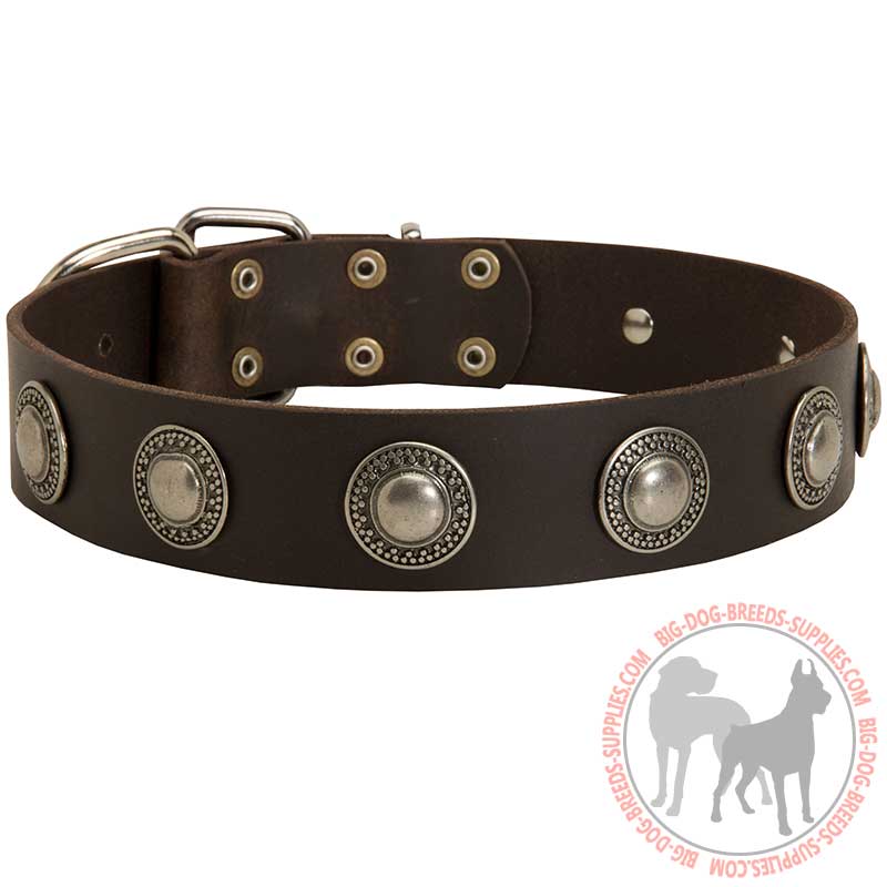 - It is incredibly gorgeous. Being usually studded, this collar is absolutely unusual. The design of conchos is very sophisticated: they have smooth pearl-like core surrounded by round masterly carved edges. Check it yourself, it will look so great on your dog!