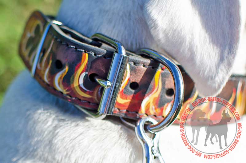 Flames Painted Leather Dog Collar is a perfect equipment for those who value quality, style and reliability. It is manufactured of full grain genuine leather so it is soft, strong and dog-friendly. Due to double plied structure, this collar is extremely durable and long servicing; it can easily withstand the loads of training, pulling of walking on a leash and any other activity of your canine.