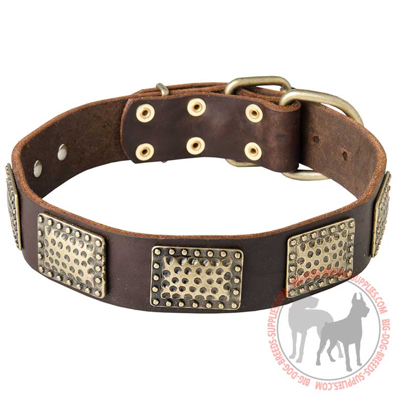 Decorated with Brass Plates Leather Dog Collar Meant for Showy Walks