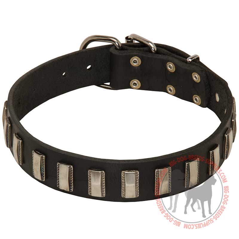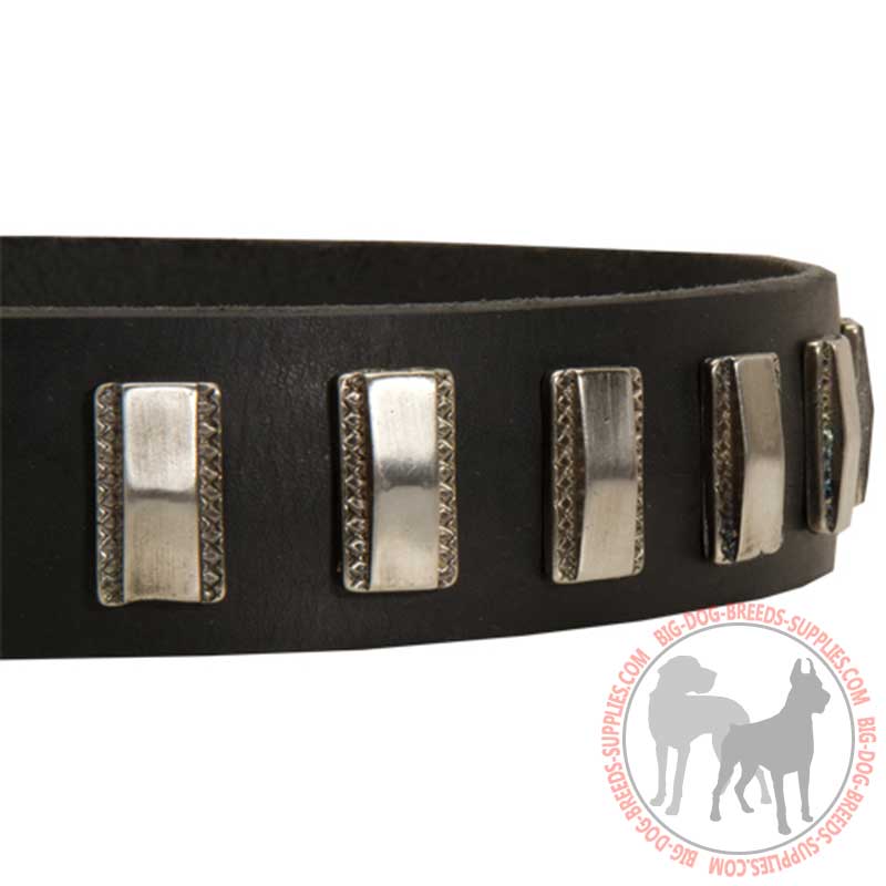 Designer 1 1/2 inch (40 mm) Wide Leather Canine Collar with Row of Vertical Plates