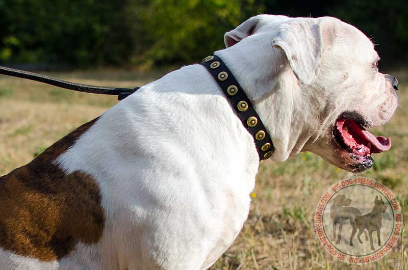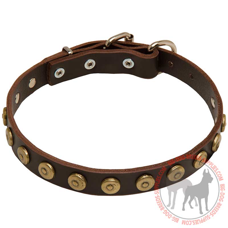 Do you like to put on your dog only premium quality comfortable and stylish equipment? Then, you are on the right page! Here we present you this Professional Walking and Training Leather Dog Collar Decorated with Brass Circles. Its look is amazing, isn't it? Small brass circles, set by hands around the collar face will make your pet's appearance unforgettable. Walk your four-footed friend in style!