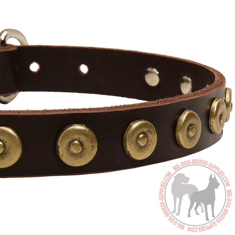 - The collar is decorated with small brass circles with dotes, riveted to the tool not to fall off in years. The fittings are also rust-proof and will delight you and your pet with their shining look for a long period of time.