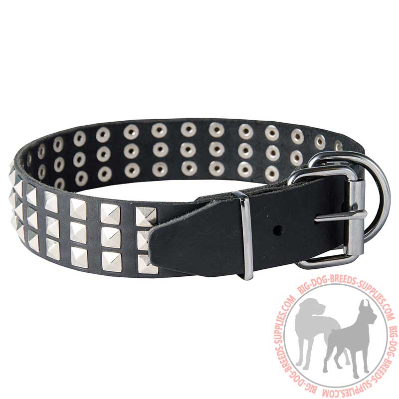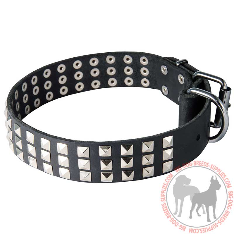 Dog leather collar with 3 rows of shining rust proof pyramids