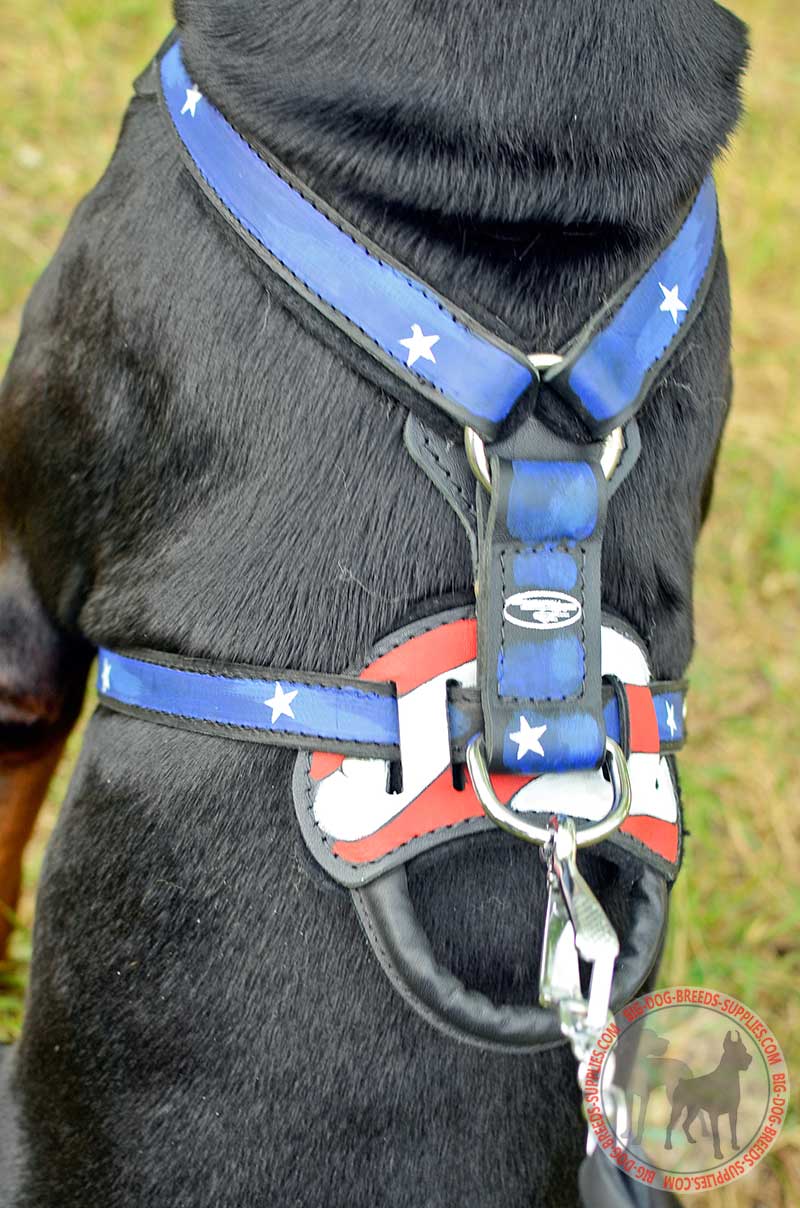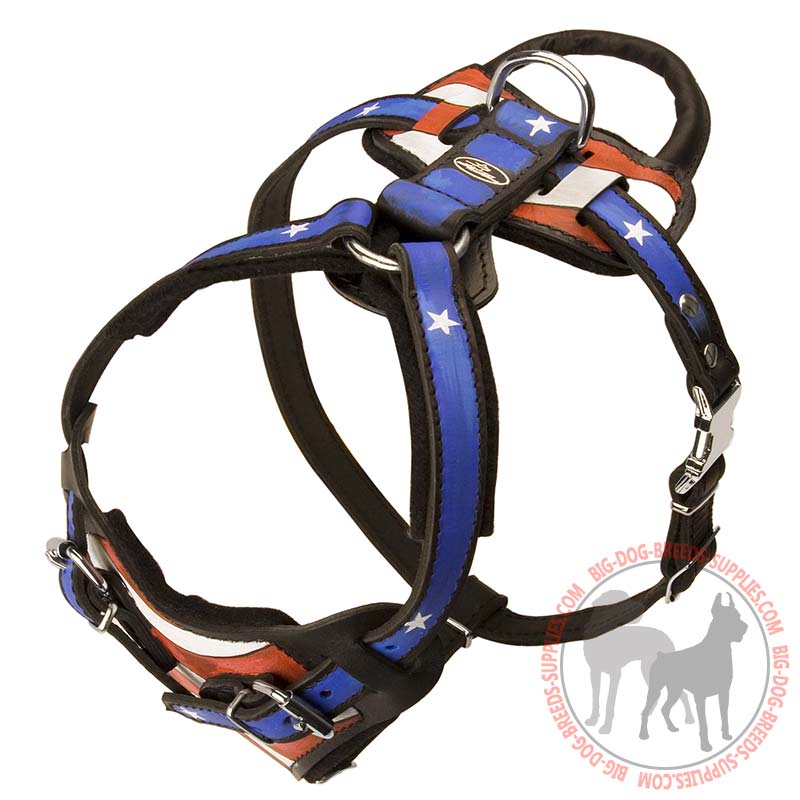 If you are looking for something original, purchase this Leather Dog Harness Painted as Americam Flag. Buy it and show that you love your country!