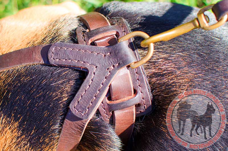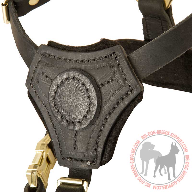 Quality basic material. Specially selected 100% full grain latigo leather, this harness is made of, is the most popular material in many industries. It is very strong and reliable material that doesn't stretch or lose its shape in decades. Thus, this leather harness will serve you and your four-footed little friend for a long time.