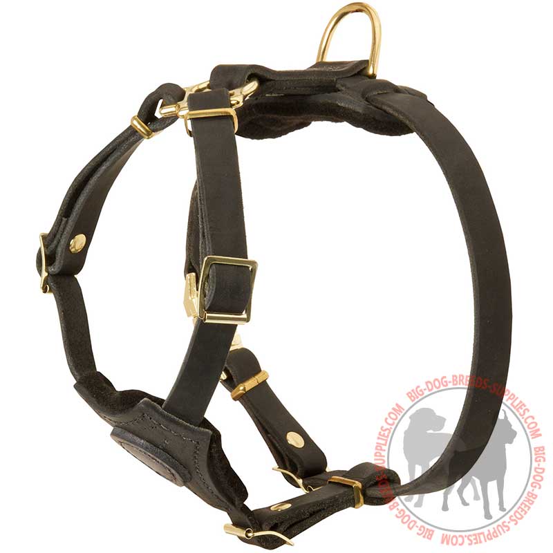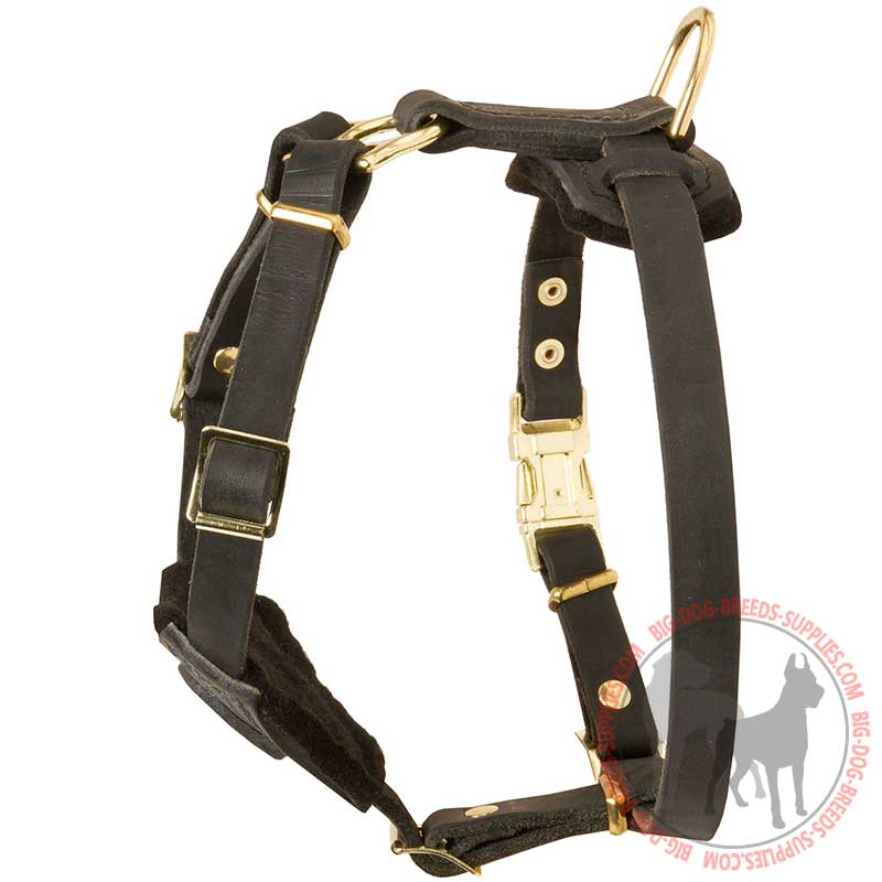 Hardware. The harness is equipped with a solid quick release buckle and D-ring. These elements are covered with rust resistant brass that will provide the tool with a royal shining color and durability. A quick release buckle will save your time significantly while preparing for a walk.