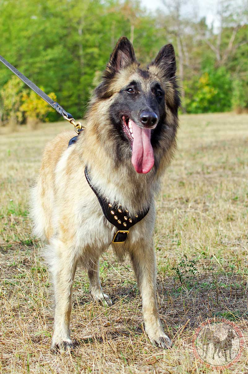 Are you tired of boring dog gears? Do you want to find something special for your dearest pet but other products are identical and featureless? Our company has big variety of dog items for any taste and purpose. Our designers have unlimited imagination and our craftsmen watch for the quality of all products. That is why our dog items are always durable, stylish-looking and comfortable for your pets. Here we offer you one of the most fabulous and stylish-looking dog harnesses. The decoration of gold-like spikes makes this gear look kingly and your dog in it will look like a member of royal family!