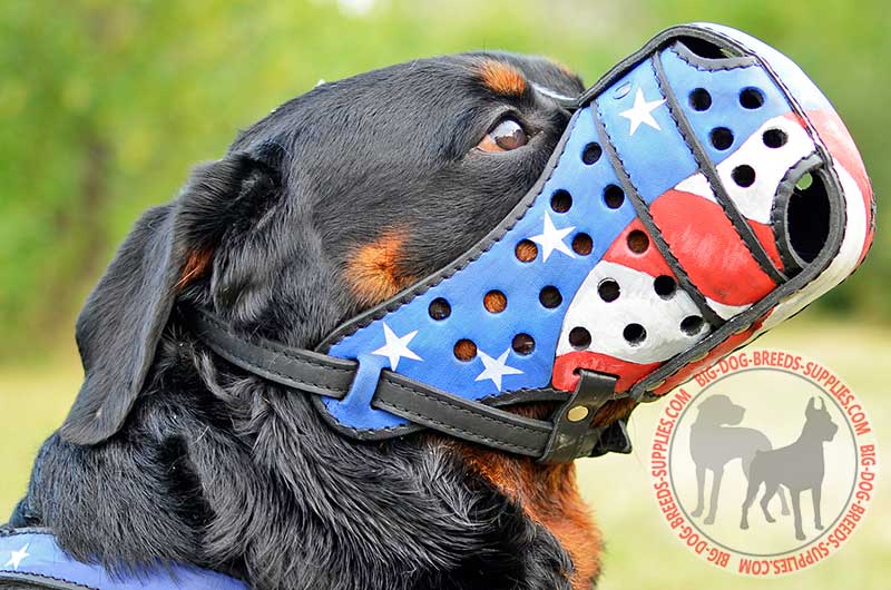 Handpainted Leather Dog Muzzle is an excellent invention of our talented and experienced craftsmen and artists. Using the combination of blue, red and white colors our staff succeeded in recreation of the USA flag on the surface of this dog muzzle. However, it is not just a patriotic symbol, but functional and high quality training equipment.