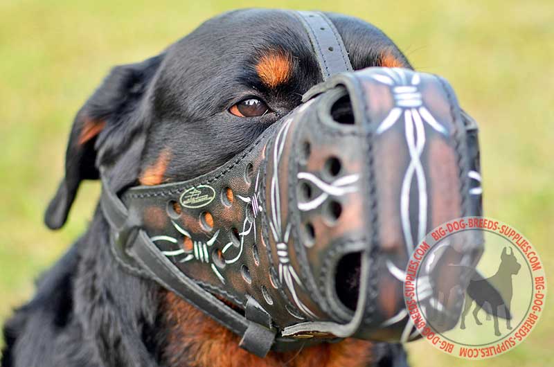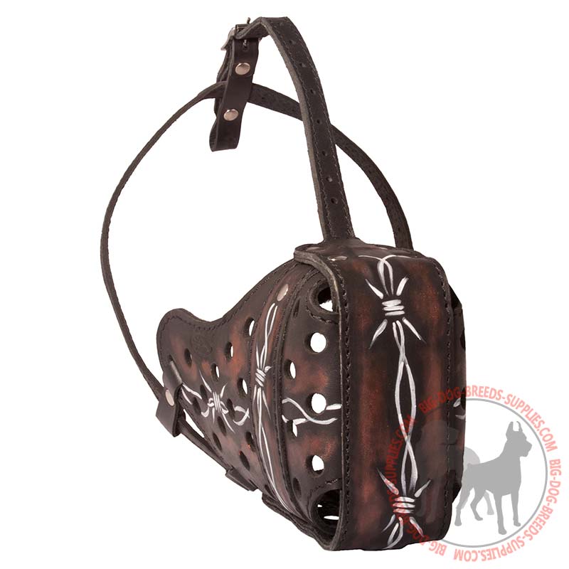 Dear dog owner! Let's train your dog in style! We present you the new model of painted dog muzzle. This Extra Strong Leather Muzzle with Barbed Wire Ornament is perfectly used for agitation training. With the new supply on, your four-footed friend will enjoy every minute while different activities are performed.