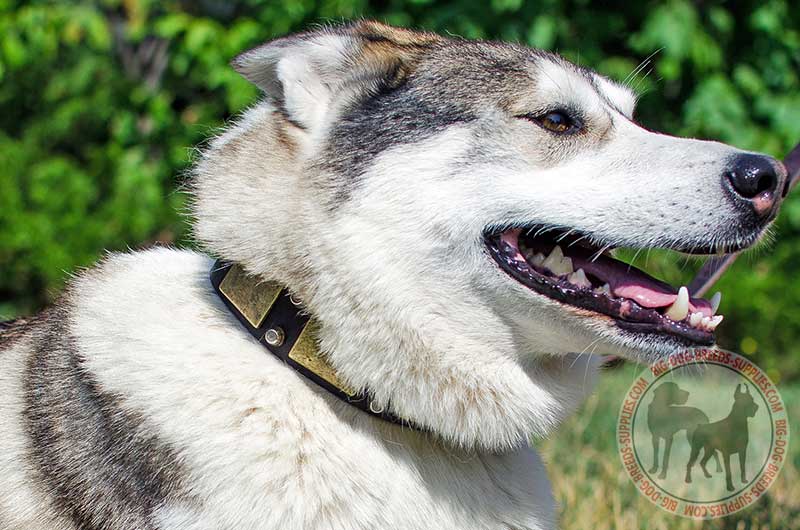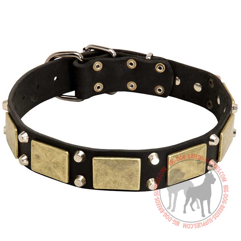 - Design. This collar has an unusual decoration. There are vintage looking brass plates. But don't worry they are not looking old-fashioned. Together with silver-like shiny cones they make very stylish combination. This collar will add some style to your dog's look.