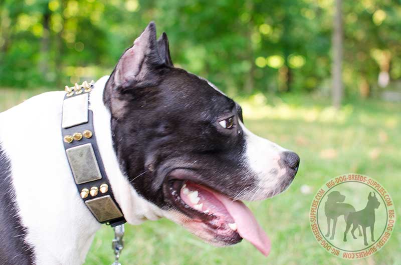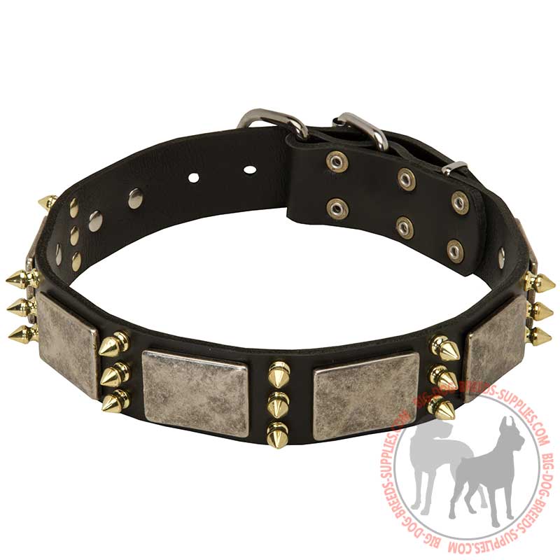 - The design is exclusive and fashionable. Gold-like spikes look great together with vintage nickel plates. That decoration makes this dog equipment unique.