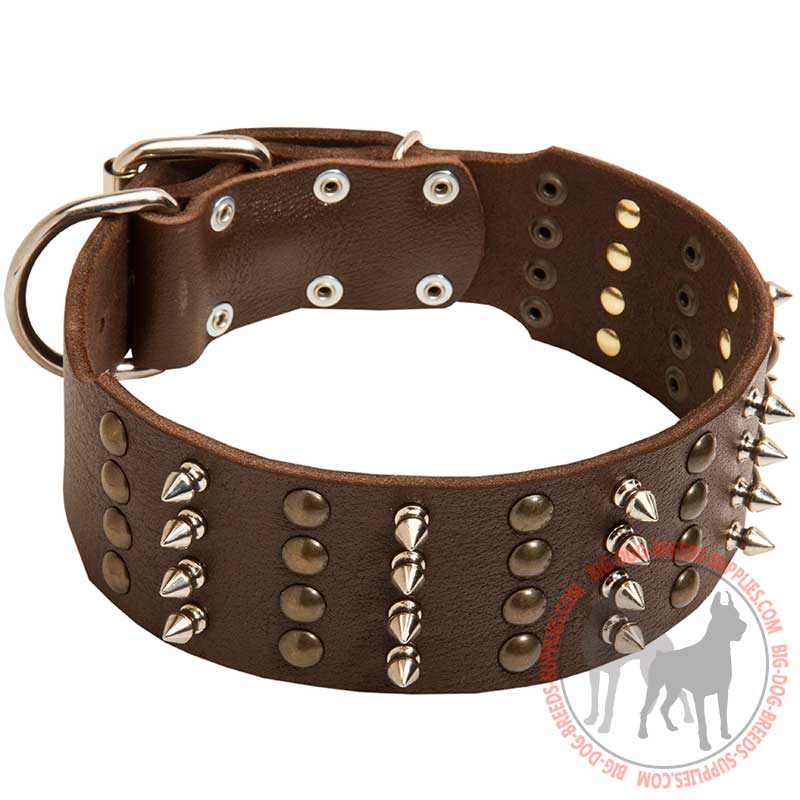 Furthermore, this Dog Collar is really beautiful. 4 rows of shining spikes and studs look amazing. Extra width adds royal chic and accentuates your dog’s uniqueness. Your fantastic pet will certainly be a star among other dogs!